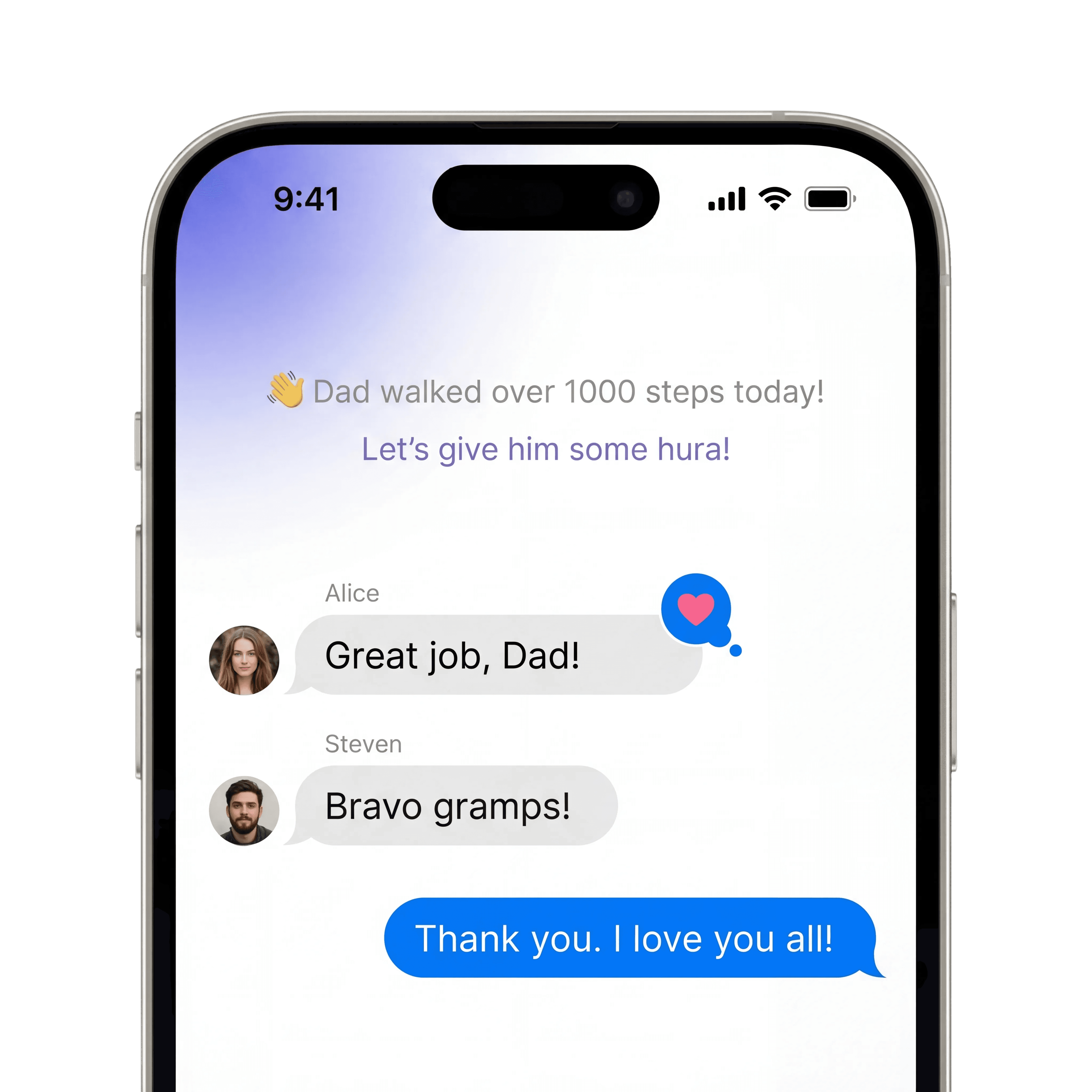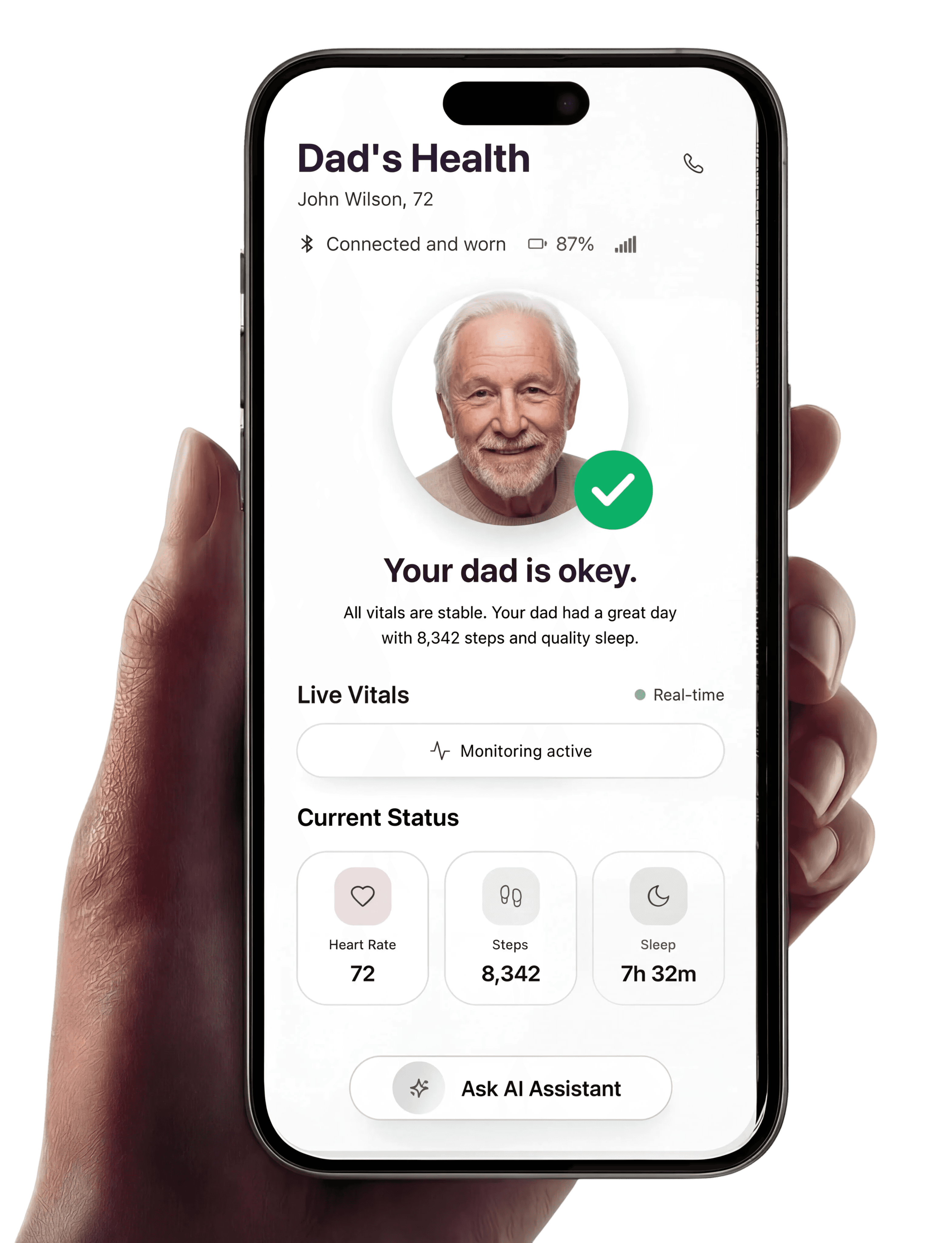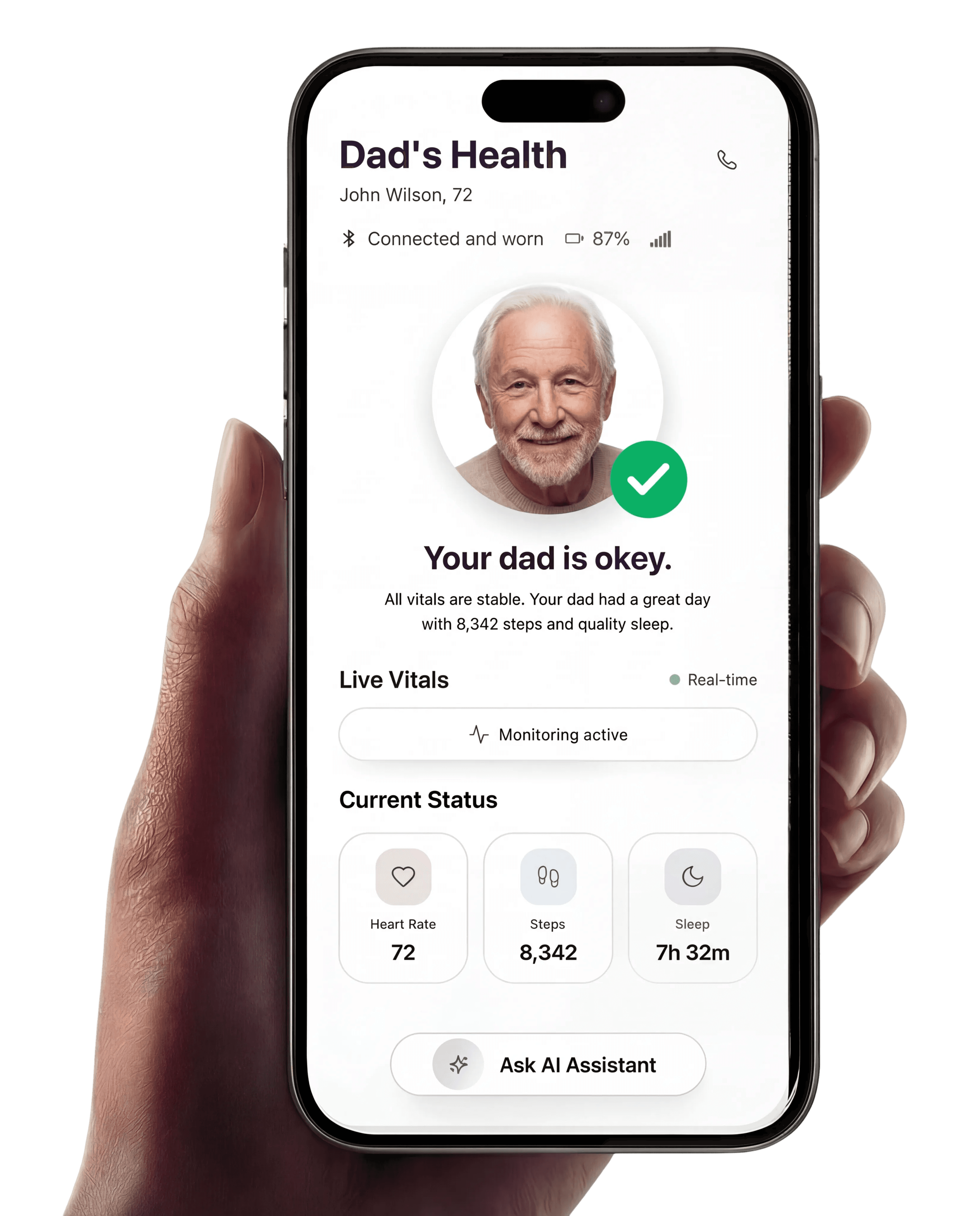 Movement, activity, and sleep levels help you understand how active and well-rested your parent is. Every notification is designed to support and improve their well-being.