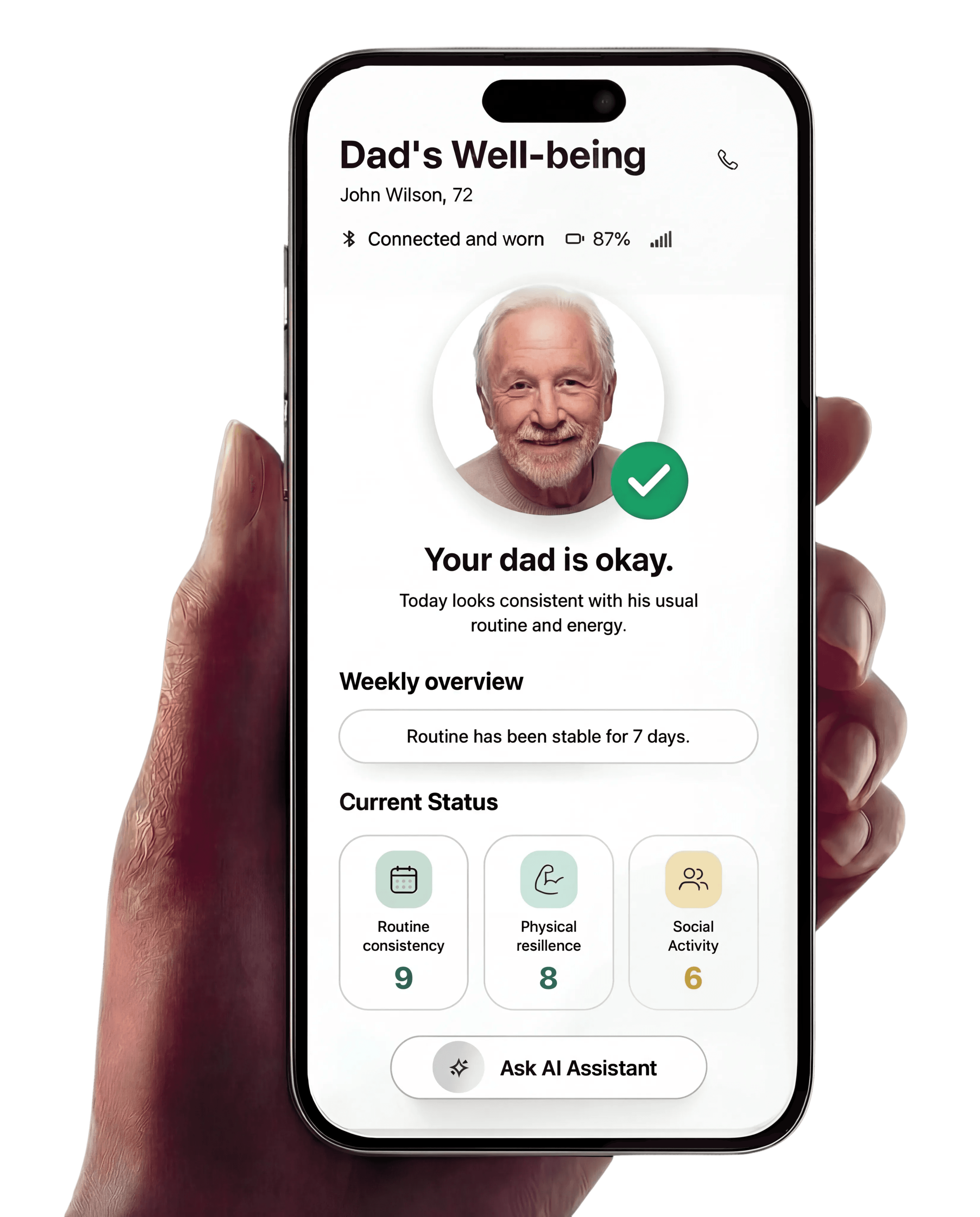Learns your parent’s daily patterns and gently notifies you when something meaningfully changes, before small issues become bigger concerns.