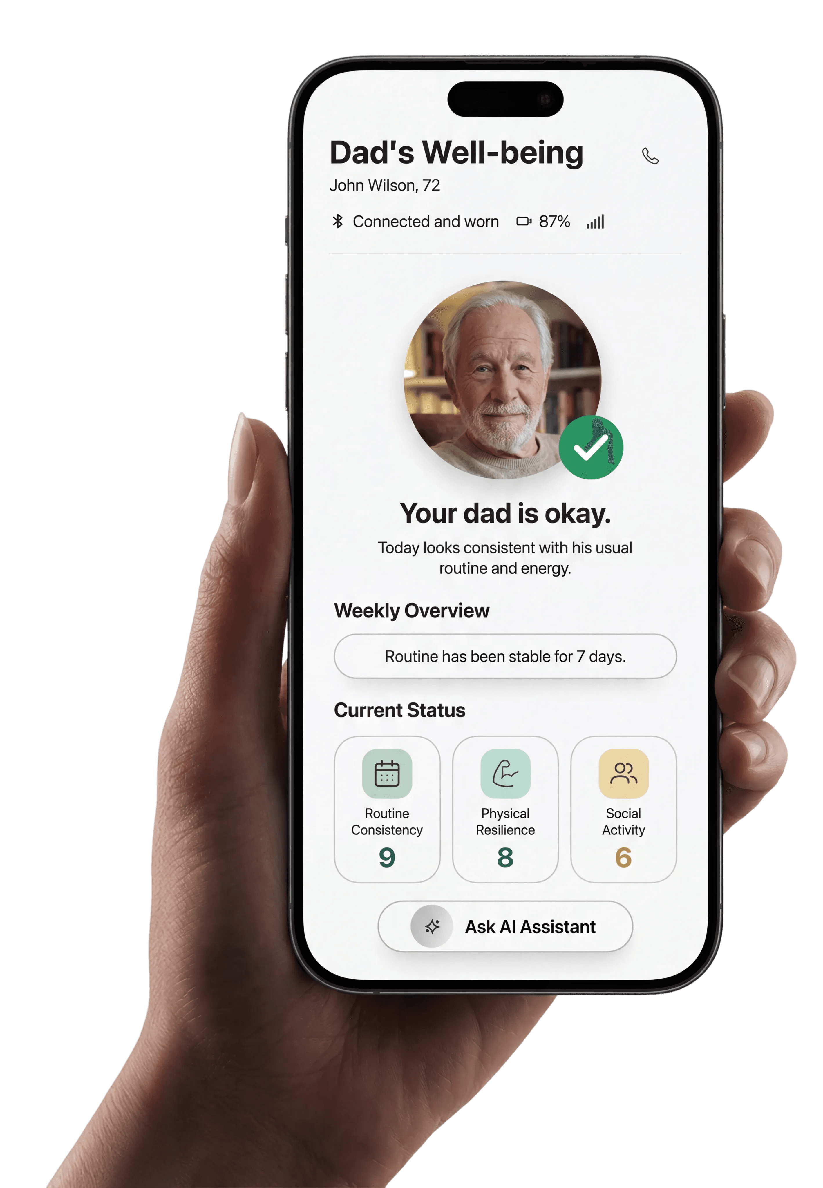 Carely is a wearable designed to help families care for aging parents by quietly understanding daily routines and notifying caregivers when something meaningfully changes.